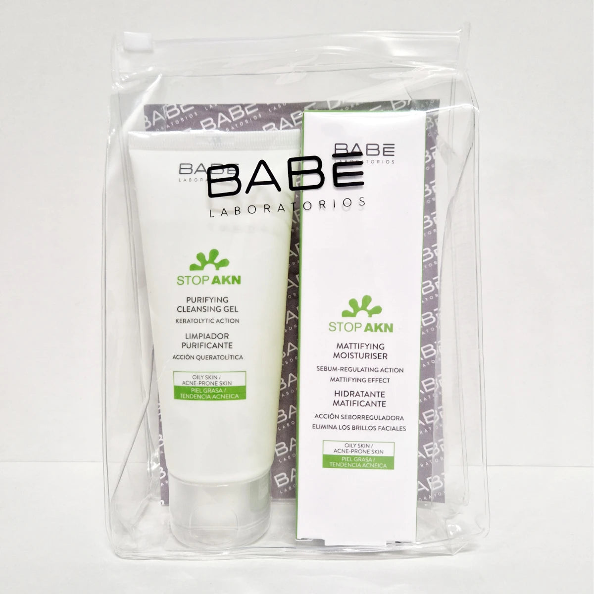 Tuotepakkaus, joka sisältää hoitotuotteet rasvaisen tai epäpuhtaan ihon puhdistukseen ja kosteutukseen. Matkakokoiset tuotteet on pakattu läpinäkyvään pussiin, joten ne on helppo ottaa mukaan matkalle.