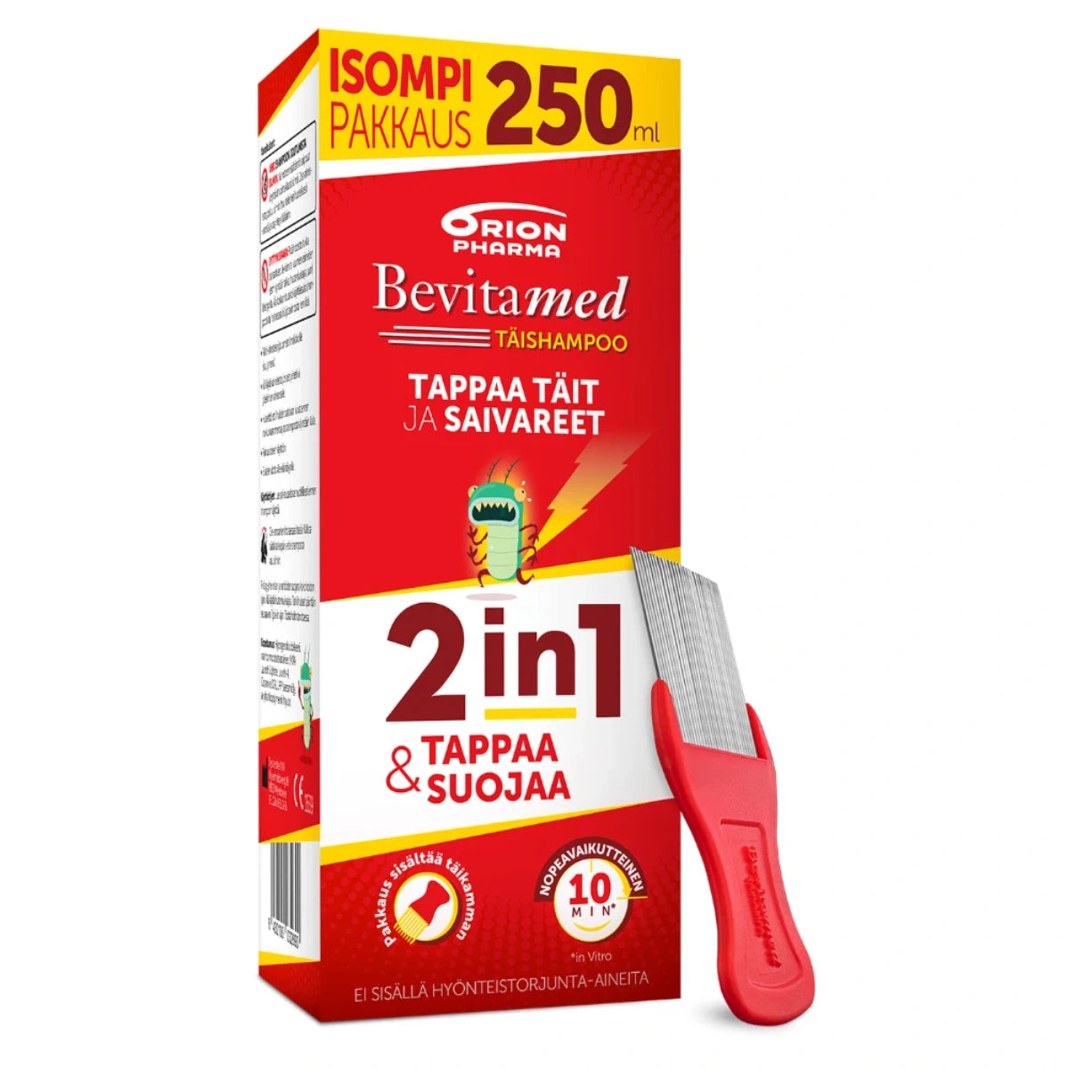 Käyttötarkoitus:Nitistä täit ja ehkäise uudet tartunnat. Kaksivaikutteinen 2-in-1-täishampoo, joka tappaa täit ja saivareet sekä ehkäisee uudet tartunnat. Bevitamed Täishampoo on helppokäyttöinen ja nopeavaikutteinen: tehoaa 15 minuutissa. Ei sisällä torjunta-aineita, eikä tuotteelle kehity vastustuskykyä.