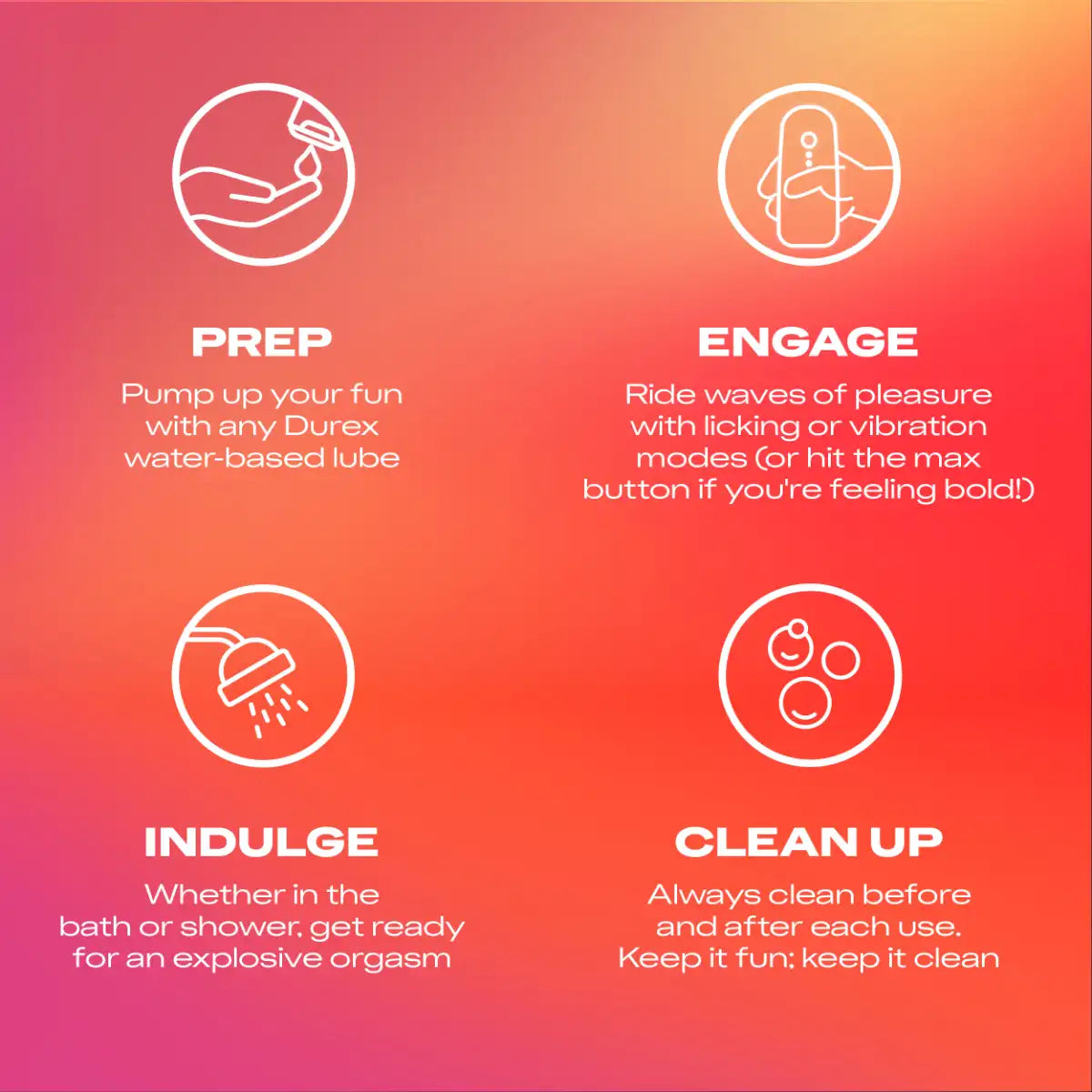 3 nuolenta- ja 7 värinäasetusta, max-painike voimakkaaseen ja räjähtävään orgasmiin. Pehmeä, kuvioitu, uurrettu malli on suunniteltu antamaan tuntemus kumppanista. Vedenkestävää tuotetta voi käyttää suihkussa, kylpyammeessa, ym. Tuotteen mukana huomaamaton matkapussi ja sisäänrakennettu matkalukko. Mukana USB-jälleenladattava akkuja ja magneettinen USB-latauskaapeli. Tuote on helppo puhdistaa.