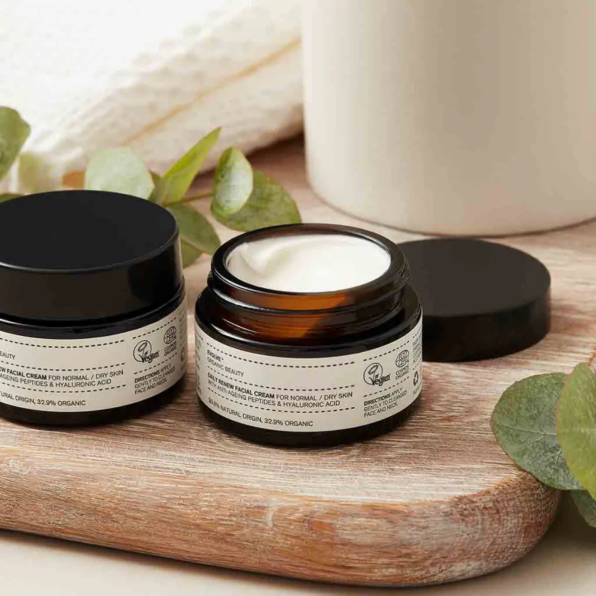 Evolve Daily Renew Facial Cream on ravitseva ja uudistava kasvovoide, joka on suunniteltu palauttamaan ihon kimmoisuus ja kosteustasapaino luonnollisten luomuöljyjen avulla. Tämä vegaaninen kasvovoide sopii erityisesti normaalista kuivalle iholle ja sisältää ihoa elvyttäviä ja suojaavia ainesosia, jotka tekevät ihosta tasaisemman ja heleämmän. Hypoallergeeninen vaniljan ja luonnollisen kookoksen tuoksu luo miellyttävän, rauhoittavan käyttökokemuksen.