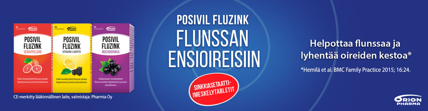 Posivil Fluzink flunssan ensioireisiin. Helpottaa flunssaa ja lyhentää oireiden kestoa.