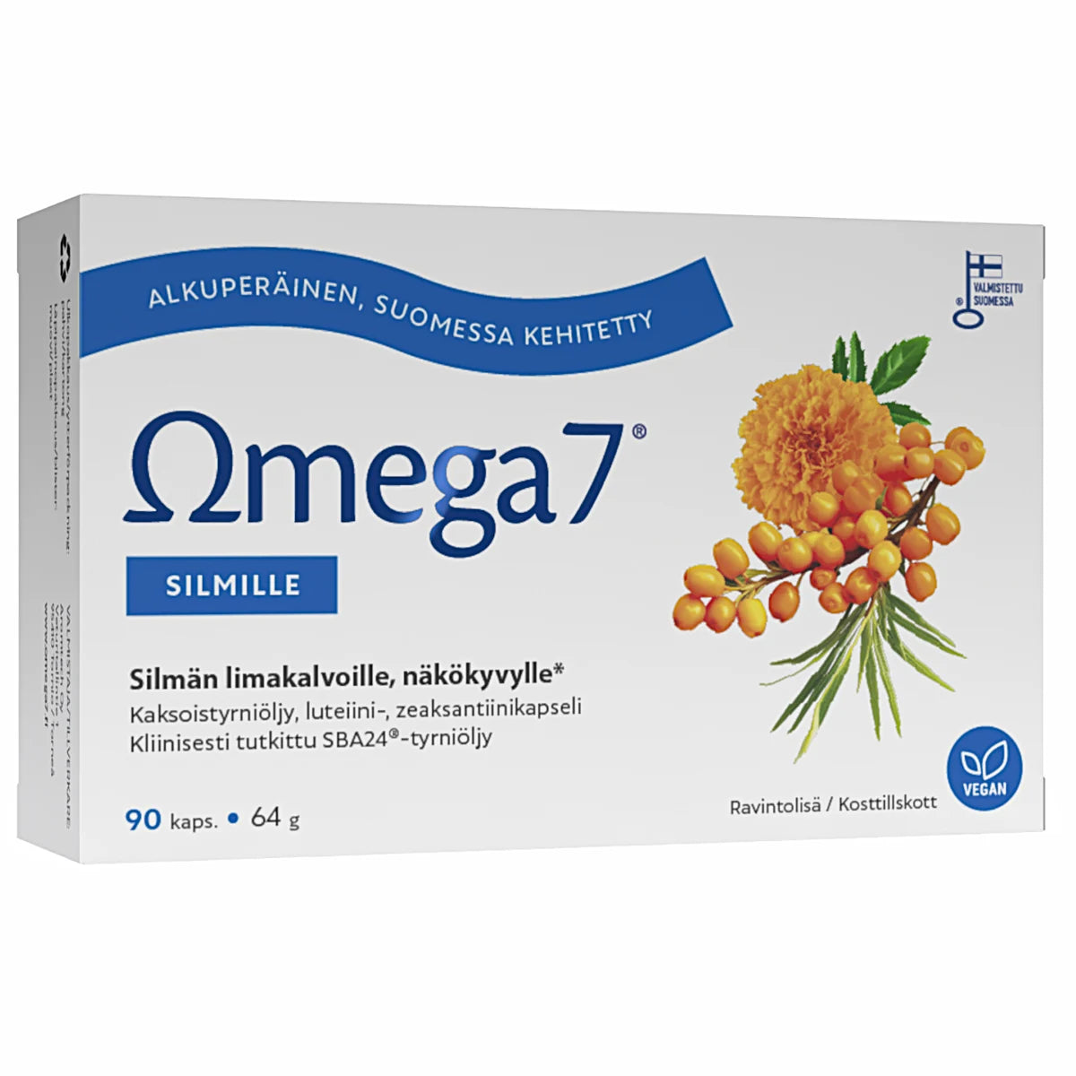 Silmien hyvinvoitiin tarkoitetut ravintolisät. Omega-rasvahapot auttavat ylläpitämään silmien terveyttä sisäisesti.